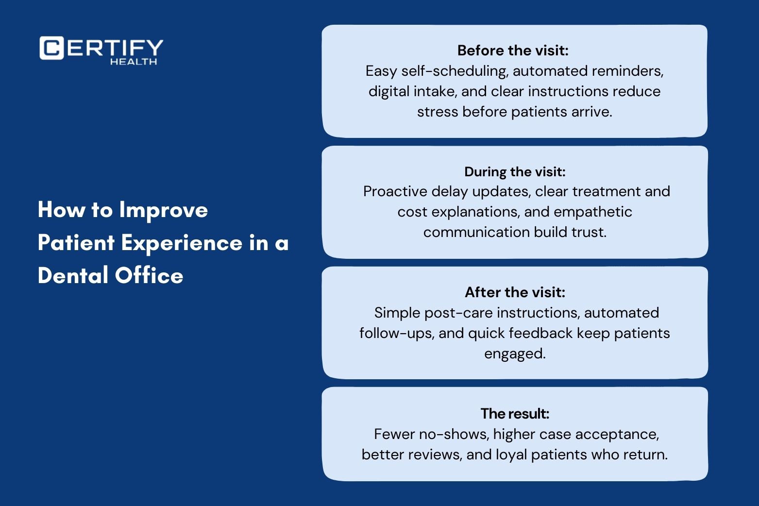 - Systems beat staff heroics: Automating routine tasks with CERTIFY Health reduces burnout, stabilizes teams, and delivers a more consistent dental experience.