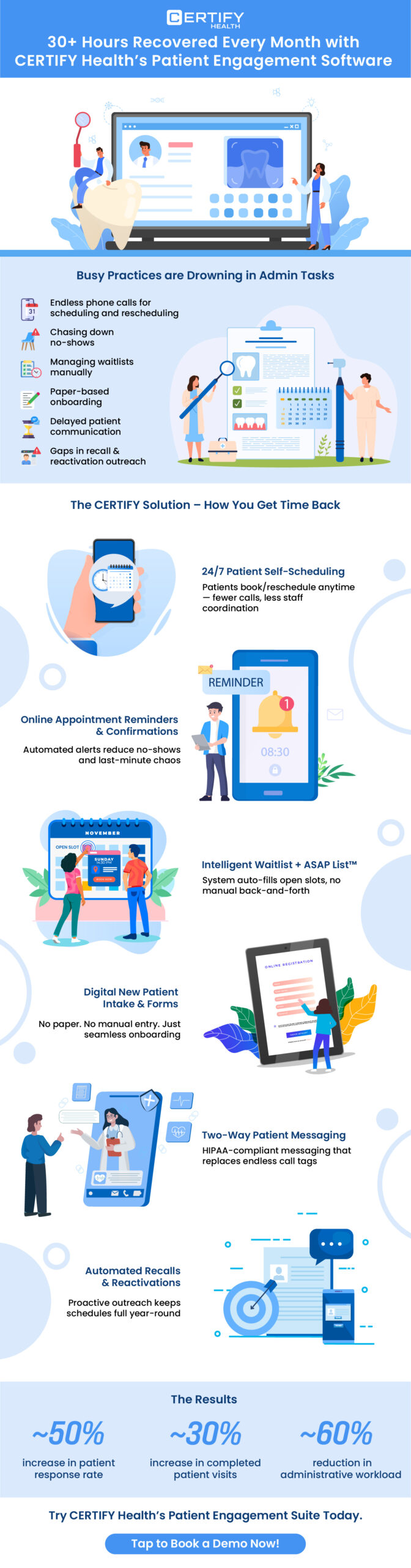 Infographic showing how CERTIFY Health’s patient engagement software helps dental practices save 30+ hours/month by automating scheduling, reminders, intake, messaging, and recalls—reducing admin workload by ~60%.