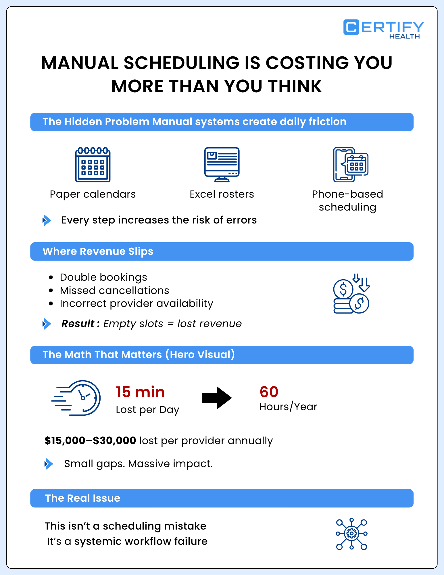 Infographic titled "Disconnected Systems Are Breaking Your Schedule" by Certify Health, highlighting challenges in healthcare scheduling. It details issues with unconnected systems, such as EHR and scheduling tools, leading to errors and inefficiencies. Problems include scheduling conflicts and increased workload. The message emphasizes that more tools do not equal better workflows.