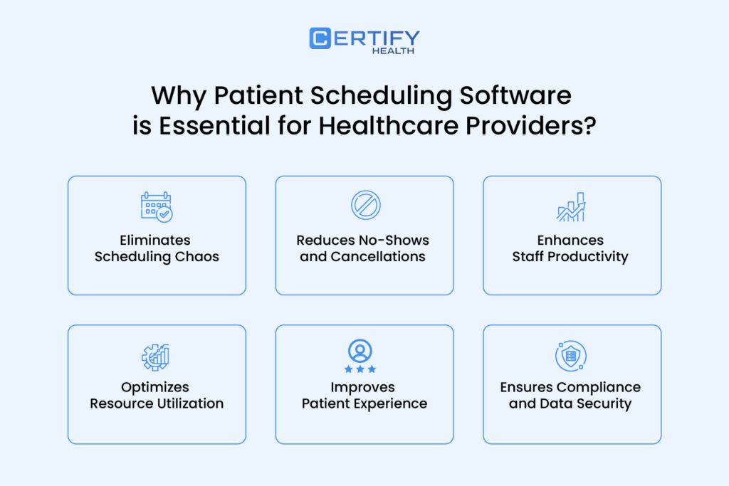 Infographic showing why patient scheduling software matters for healthcare: improves efficiency, reduces admin work, enhances patient satisfaction, cuts no-shows, and increases revenue.