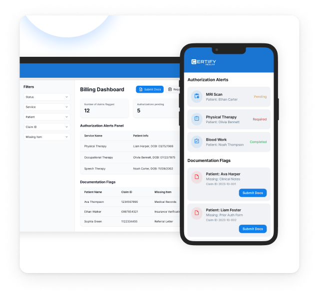 With CERTIFY Health, your charts, authorizations, and audit logs are all connected—so billing is cleaner, faster, and fully compliant.