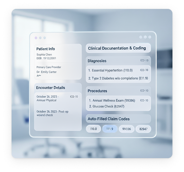 - Auto-capture of diagnoses, procedures, and encounter details.